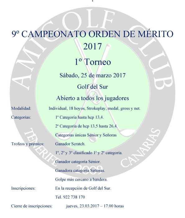 ORDEN DE SALIDAS: Siendo el 1º torneo puntuable para el Orden de Mérito 2017 las salidas serán por orden de hándicap.