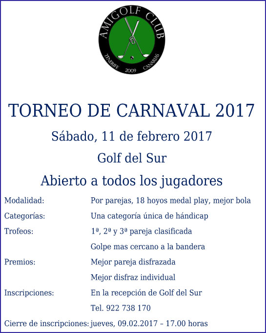 Inscripciones: En GOLF DEL SUR. Telefónicamente al nº 922 738 170. Por e-mail a golfdelsur@golfdelsur.es. Personalmente en la recepción.