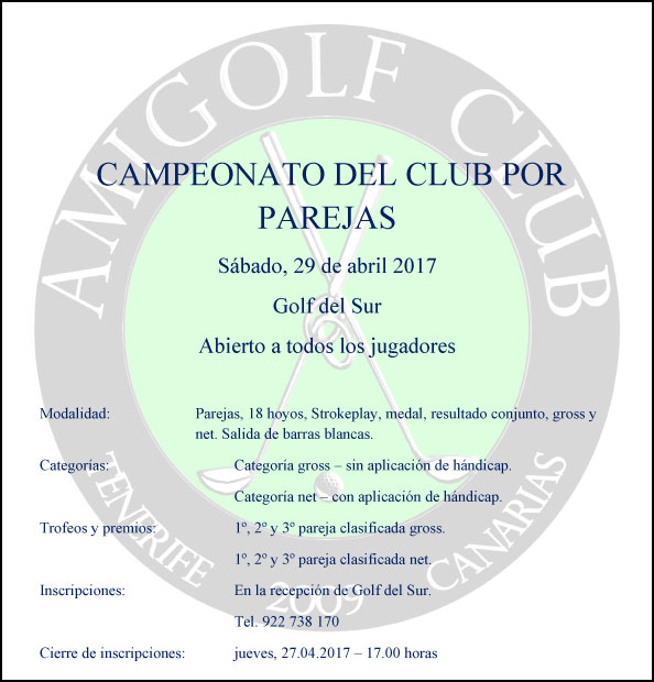 TROFEOS: Trofeos para: 1ª, 2ª y 3ª pareja clasificada, gross. 1ª, 2ª y 3ª pareja clasificada, net.